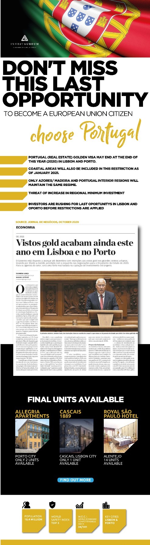 - The real estate investment option of the Golden Visa Program is expected to end in December 2020 for Lisbon and Porto, the two Portuguese main cities.